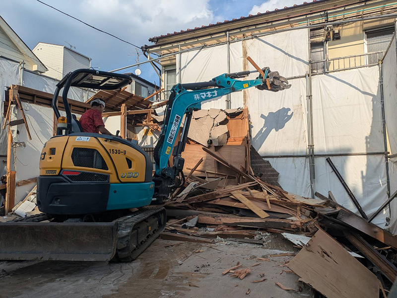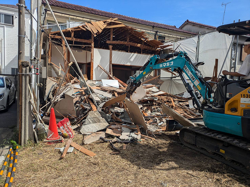 本工事では、重機を使用した解体作業を行いながらも、